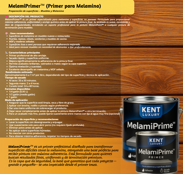 MelamiPrimer™ es un primer profesional diseñado para transformar superficies difíciles como la melamina, otorgando una base perfecta para recibir pintura con máxima adherencia. Está formulado para quienes buscan resultados finos, uniformes y de terminación premium.