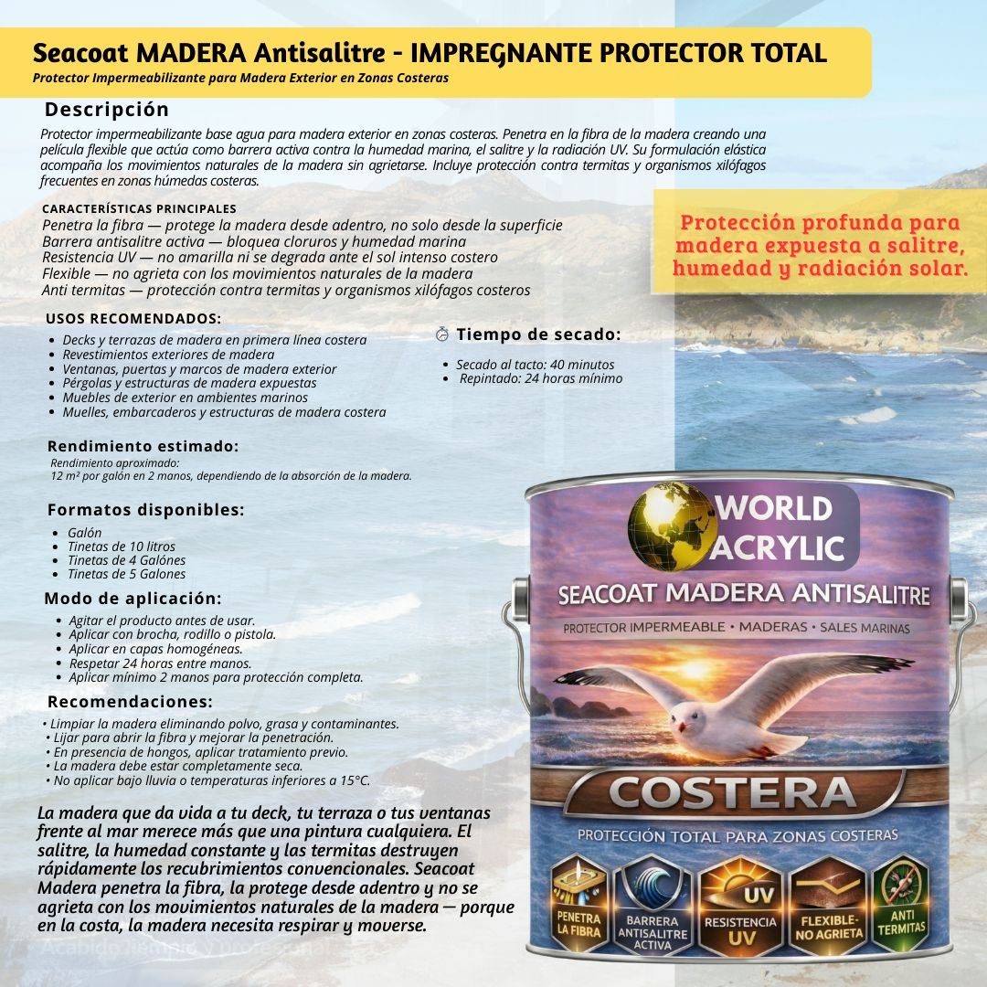La madera que da vida a tu deck, tu terraza o tus ventanas frente al mar merece más que una pintura cualquiera. El salitre, la humedad constante y las termitas destruyen rápidamente los recubrimientos convencionales. Seacoat Madera penetra la fibra, la protege desde adentro y no se agrieta con los movimientos naturales de la madera — porque en la costa, la madera necesita respirar y moverse.