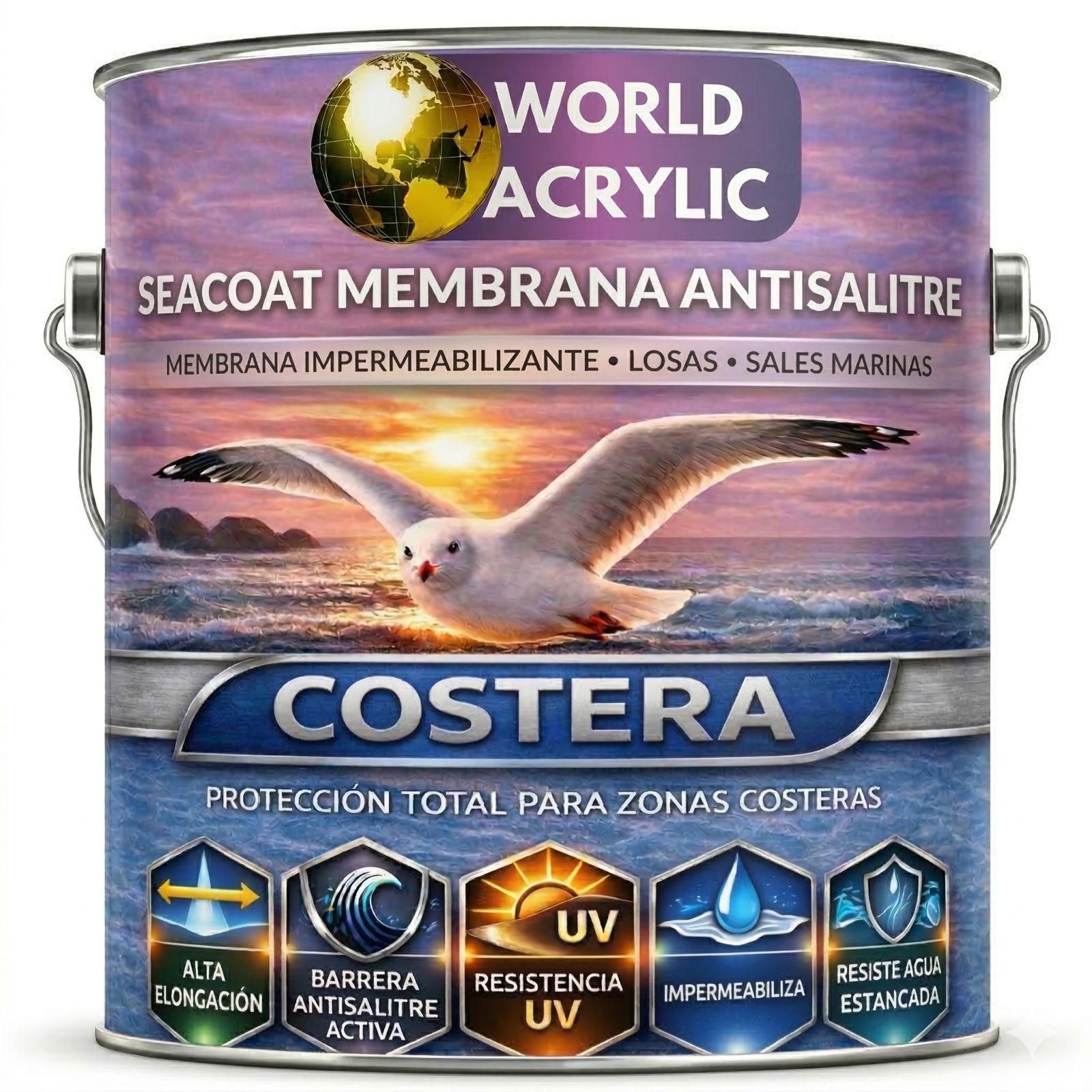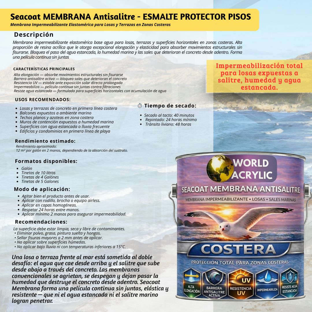 Una losa o terraza frente al mar está sometida al doble desafío: el agua que cae desde arriba y el salitre que sube desde abajo a través del concreto. Las membranas convencionales se agrietan, se despegan y dejan pasar la humedad que destruye el concreto desde adentro. Seacoat Membrana forma una película continua sin juntas, elástica y resistente — que ni el agua estancada ni el salitre marino logran penetrar.