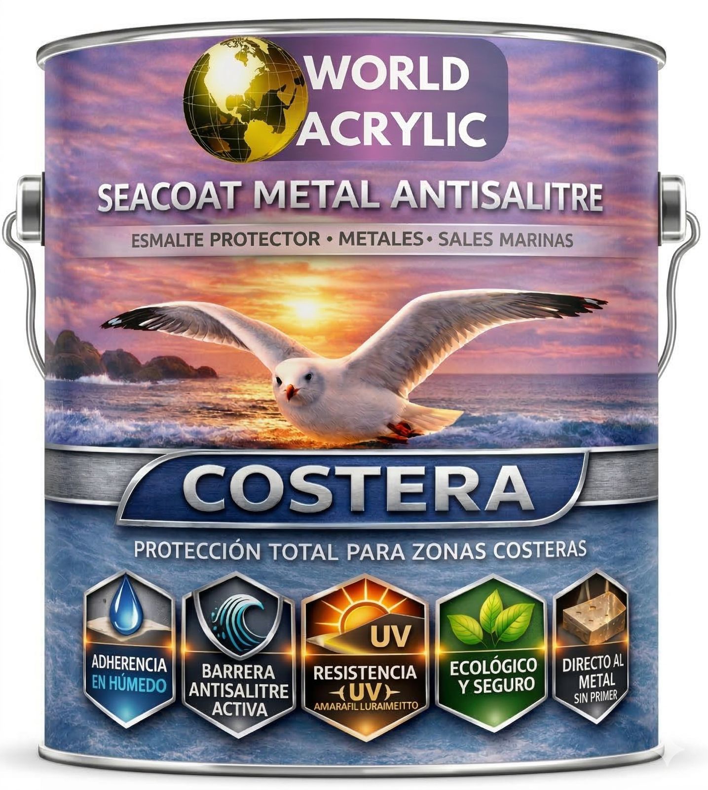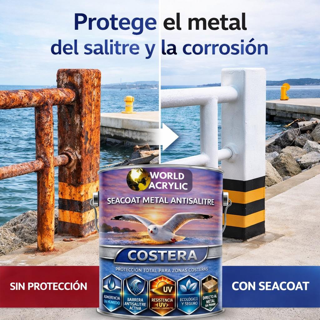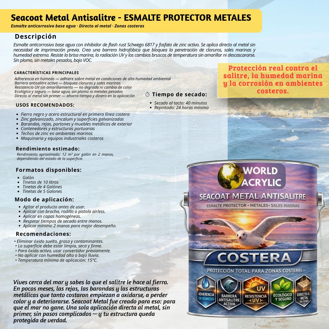 Vives cerca del mar y sabes lo que el salitre le hace al fierro. En pocos meses, las rejas, las barandas y las estructuras metálicas que tanto costaron empiezan a oxidarse, a perder color y a deteriorarse. Seacoat Metal fue creado para eso: para que el mar no gane. Una sola aplicación directa al metal, sin primer, sin pasos complicados — y tu estructura queda protegida de verdad.
